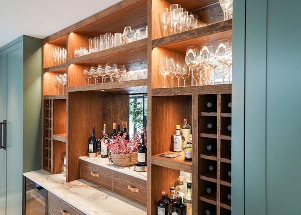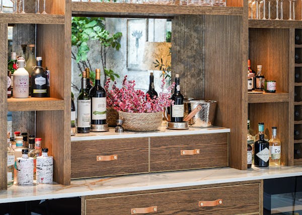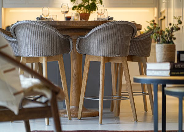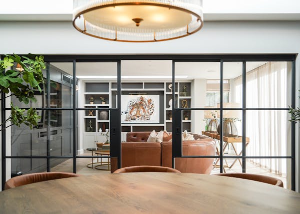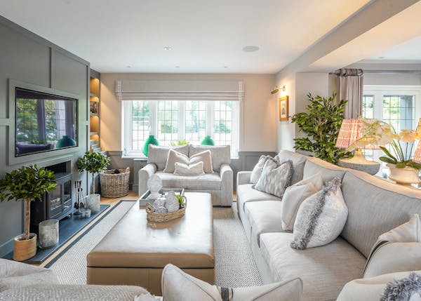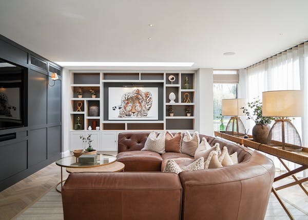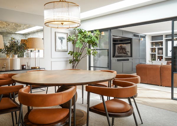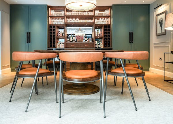 Both ends of this expansive country home, including garden facing extension were given a fresh facelift. This included procurement of bespoke sofas and footstools, rugs, new custom curtains and blinds expertly fitted by our talented curtain maker, kitchen furniture, joinery throughout and a stunning dining area featuring a sociable circle of our London Chairs in cognac.