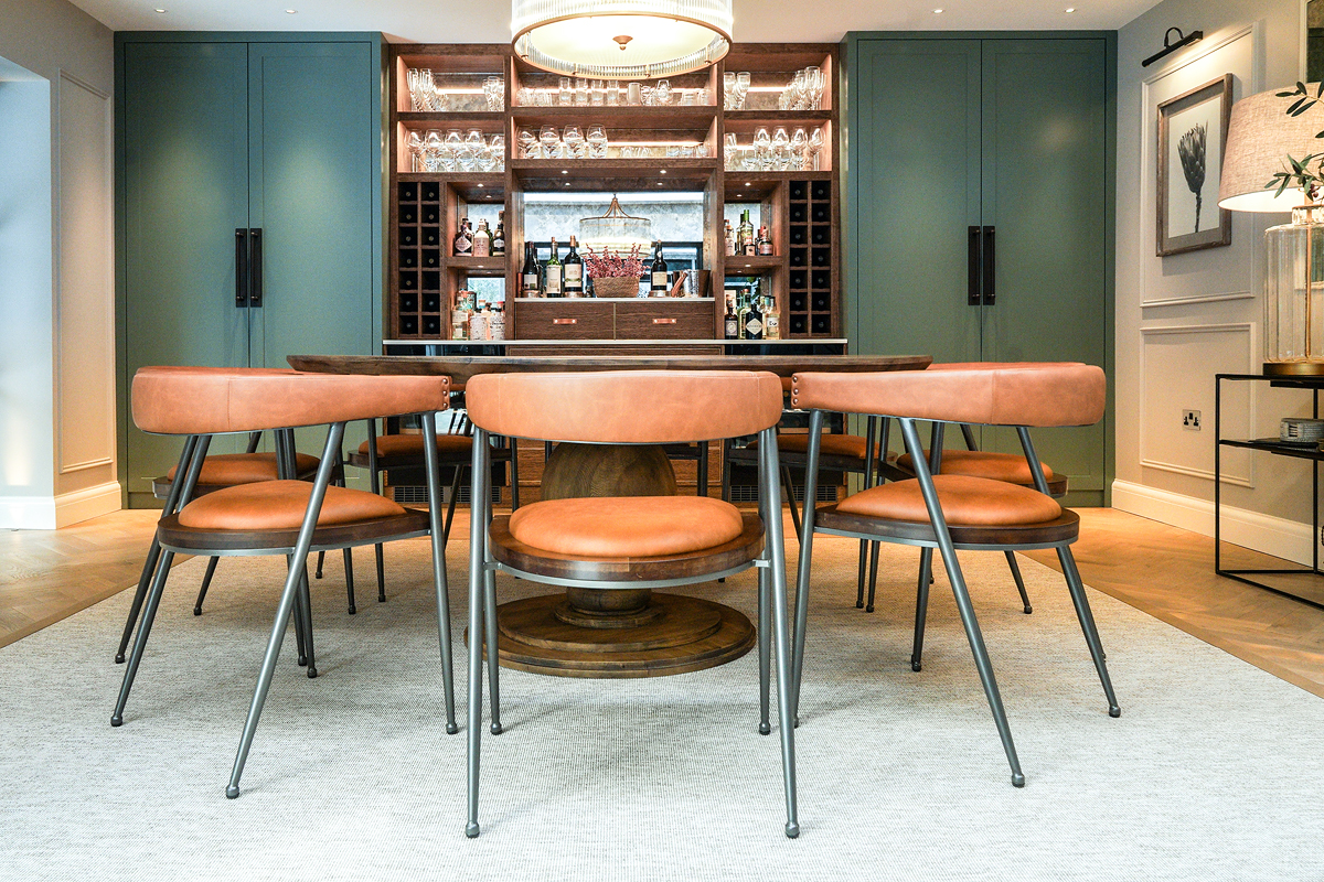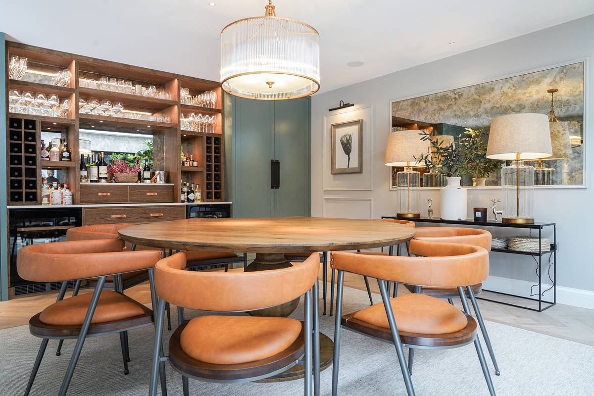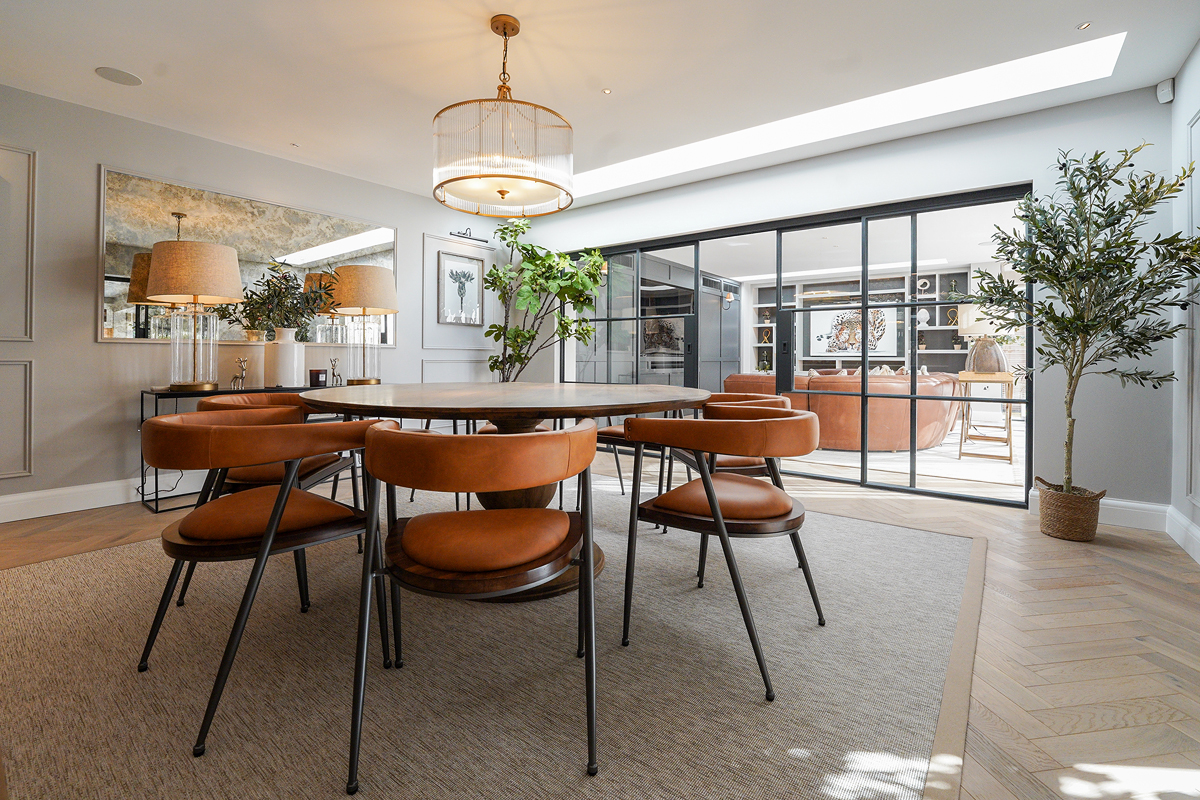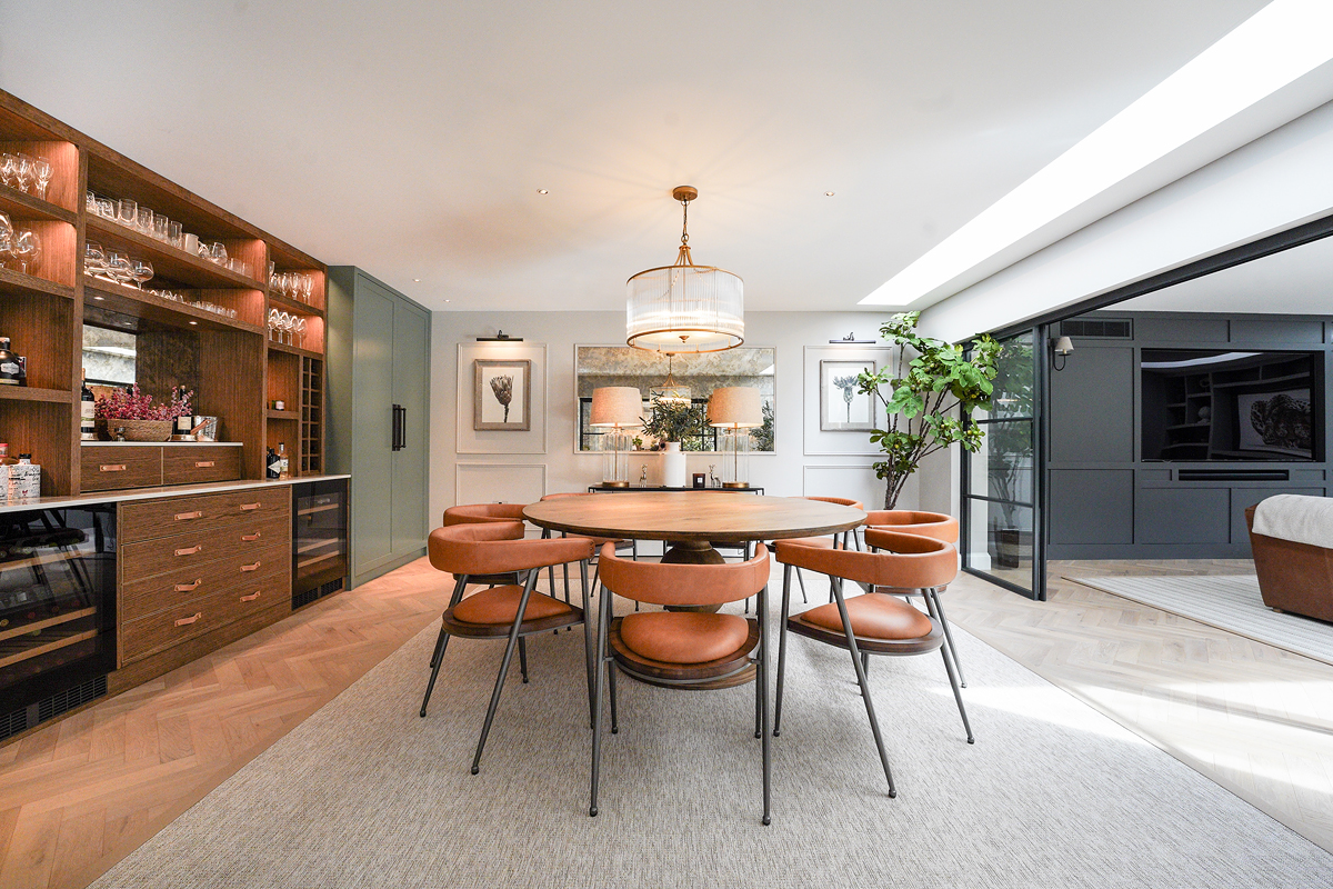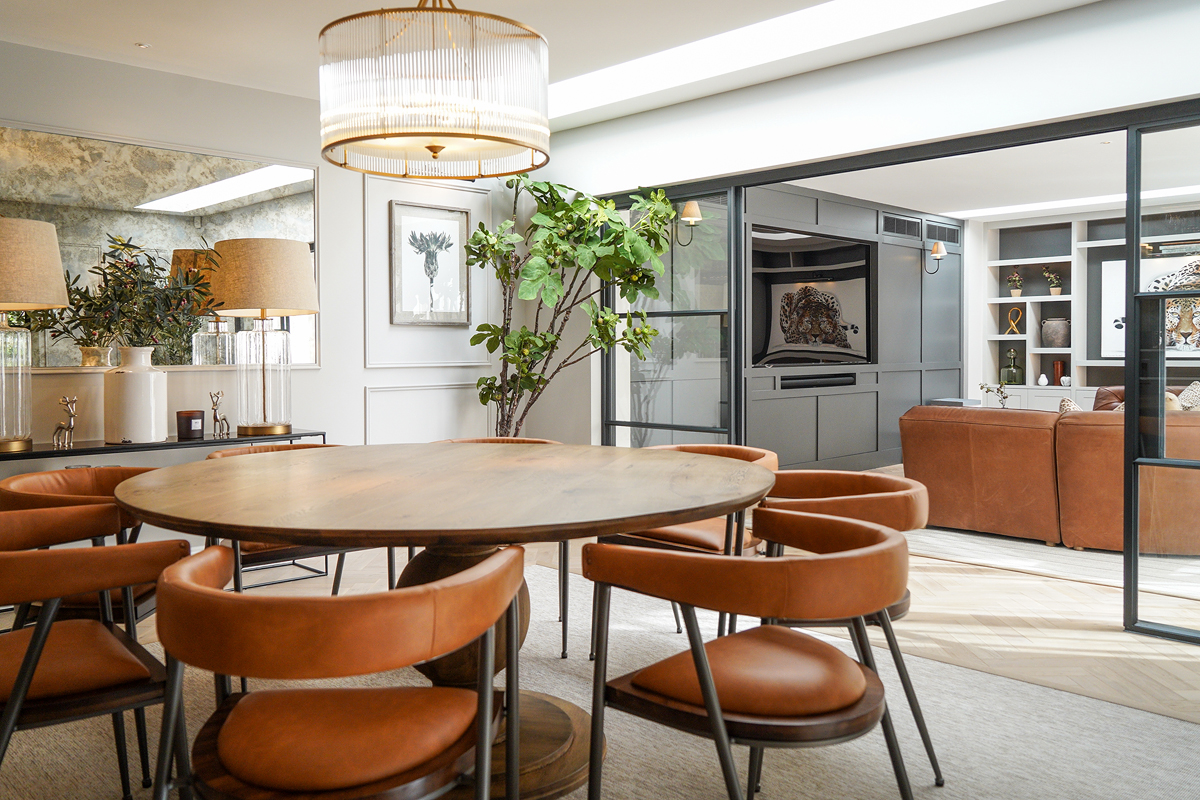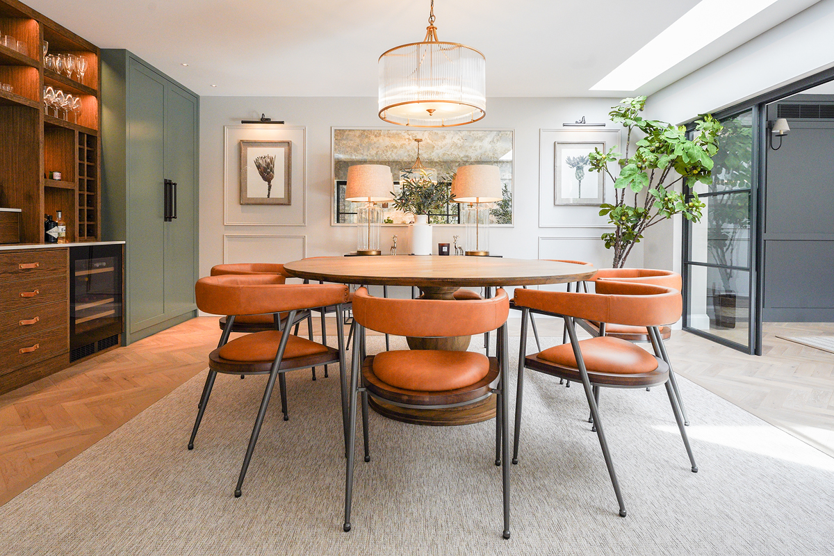 Both ends of this expansive country home, including garden facing extension were given a fresh facelift. This included procurement of bespoke sofas and footstools, rugs, new custom curtains and blinds expertly fitted by our talented curtain maker, kitchen furniture, joinery throughout and a stunning dining area featuring a sociable circle of our London Chairs in cognac.
