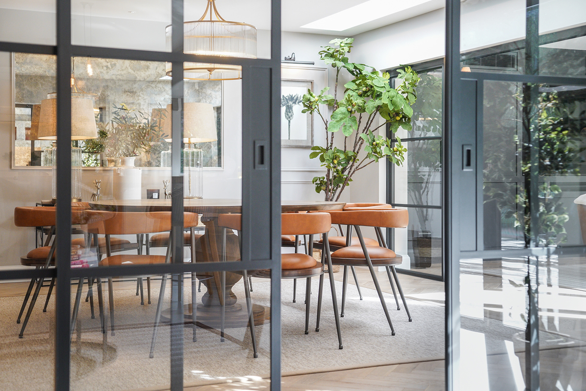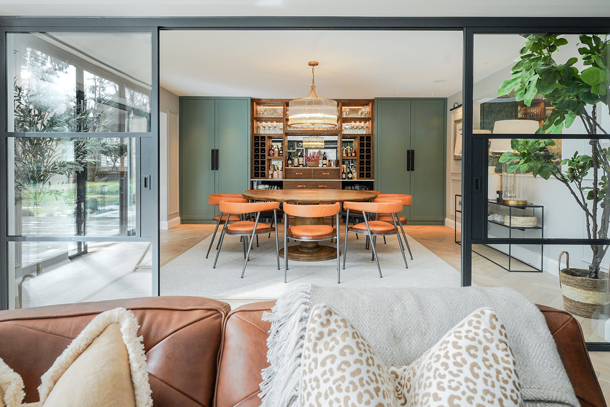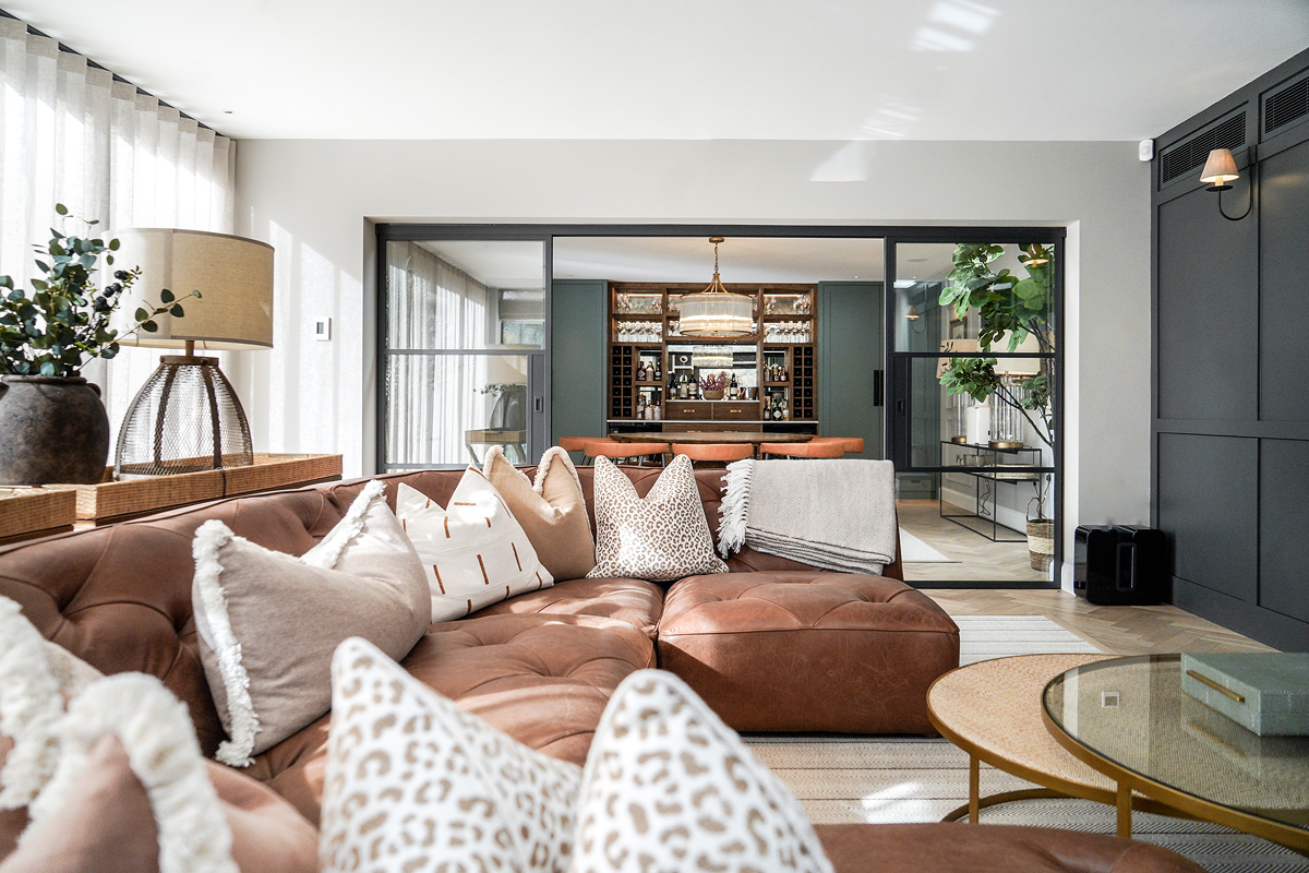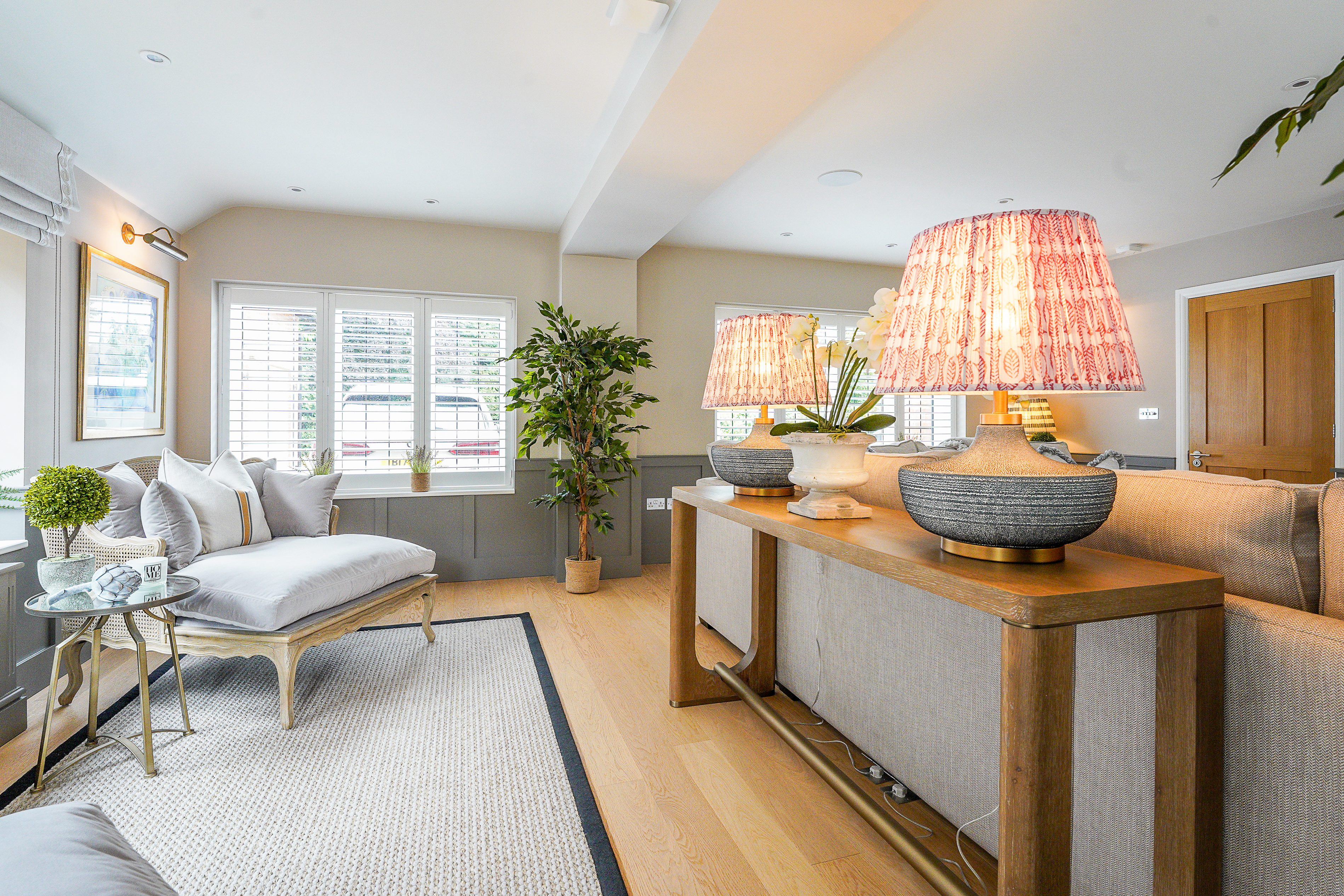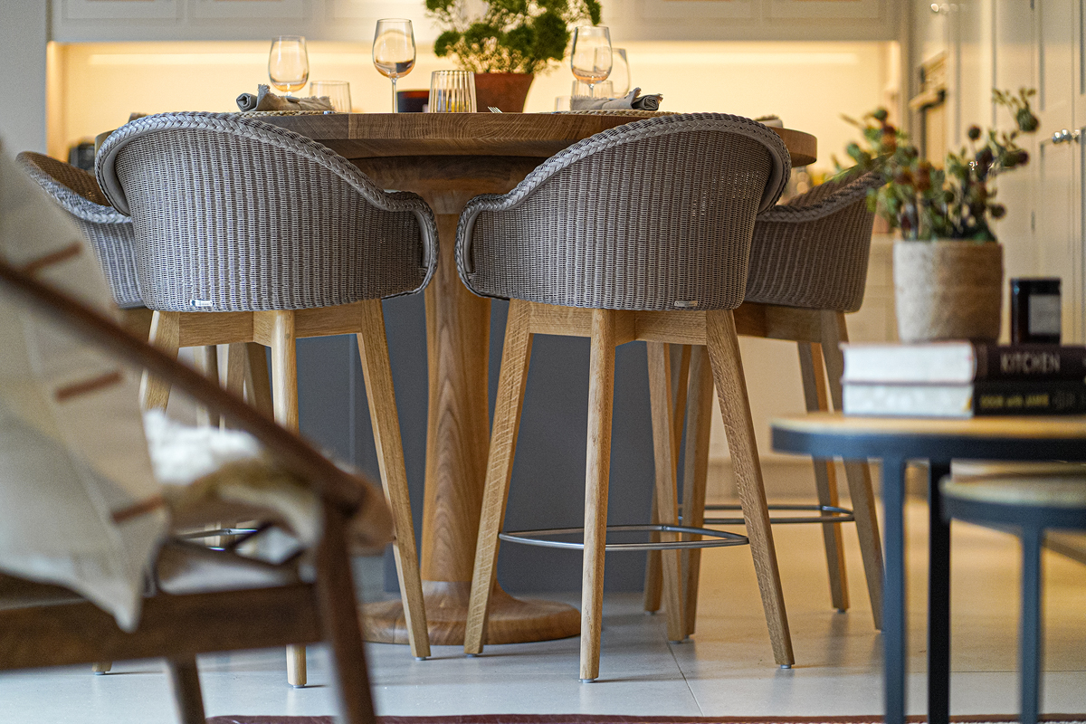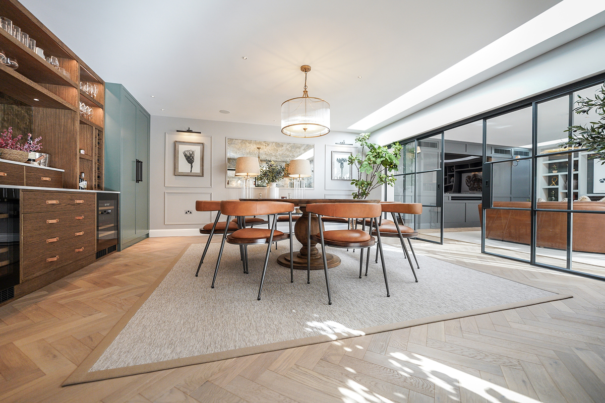 Both ends of this expansive country home, including garden facing extension were given a fresh facelift. This included procurement of bespoke sofas and footstools, rugs, new custom curtains and blinds expertly fitted by our talented curtain maker, kitchen furniture, joinery throughout and a stunning dining area featuring a sociable circle of our London Chairs in cognac.