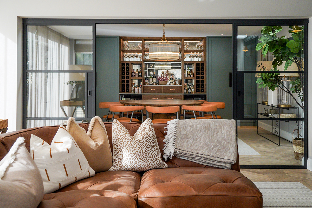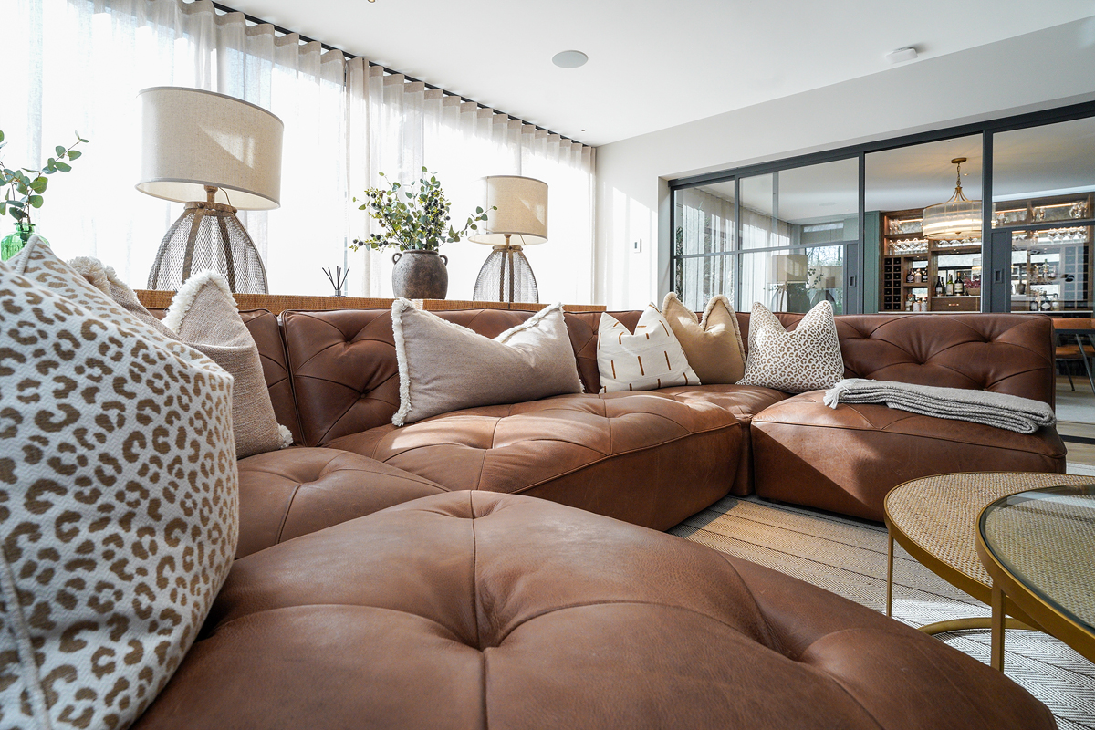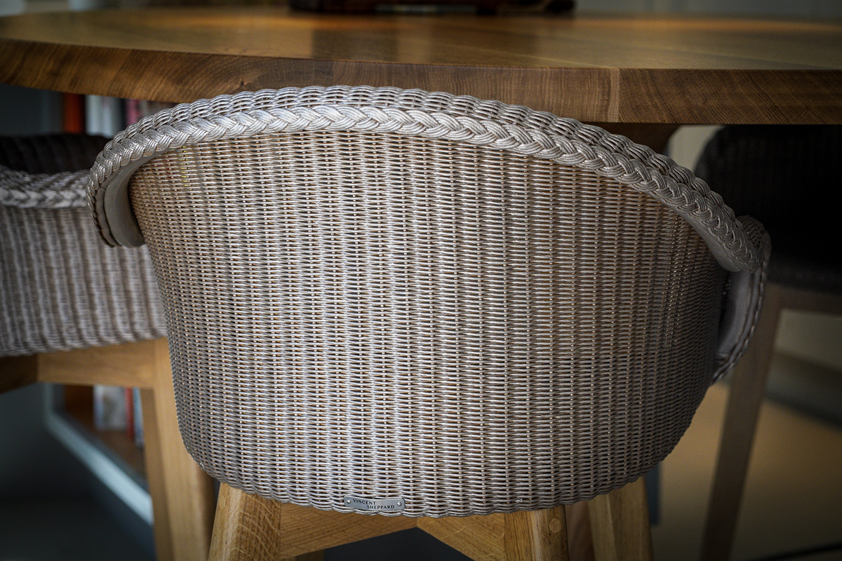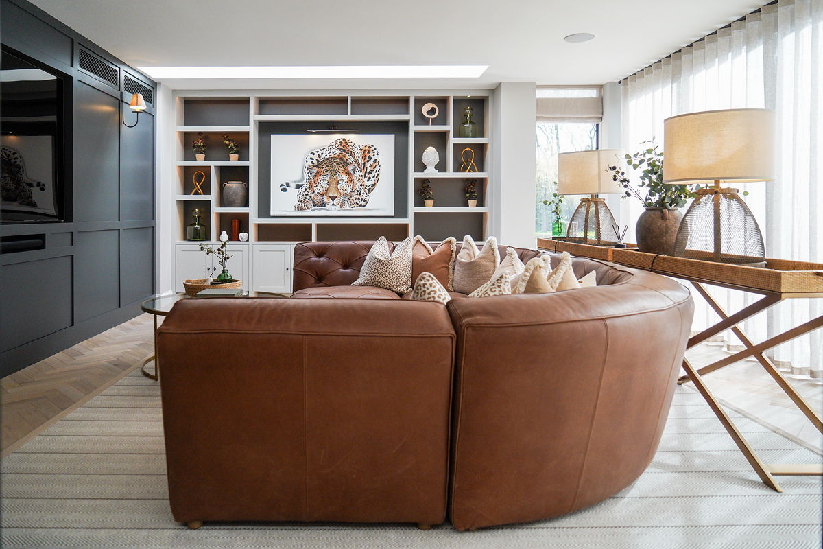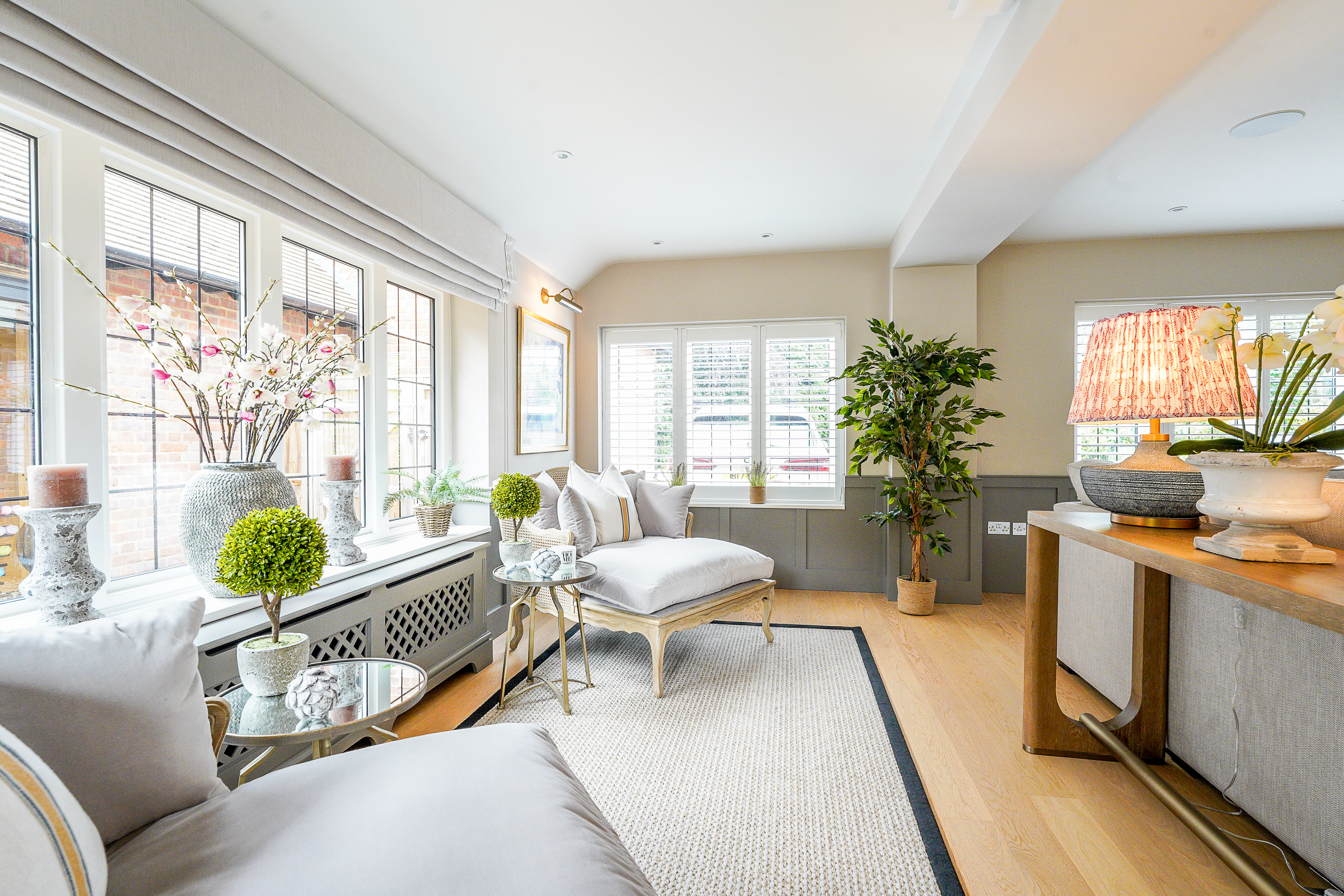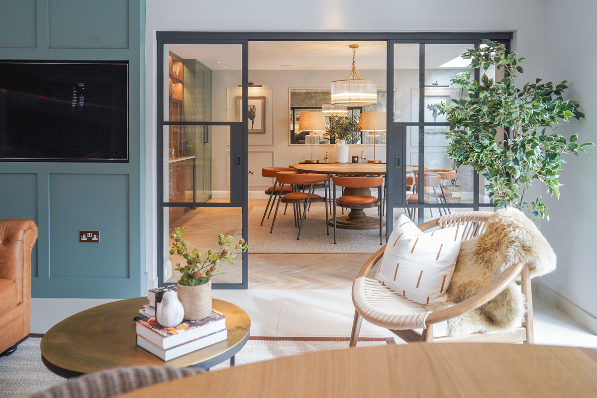 Both ends of this expansive country home, including garden facing extension were given a fresh facelift. This included procurement of bespoke sofas and footstools, rugs, new custom curtains and blinds expertly fitted by our talented curtain maker, kitchen furniture, joinery throughout and a stunning dining area featuring a sociable circle of our London Chairs in cognac.