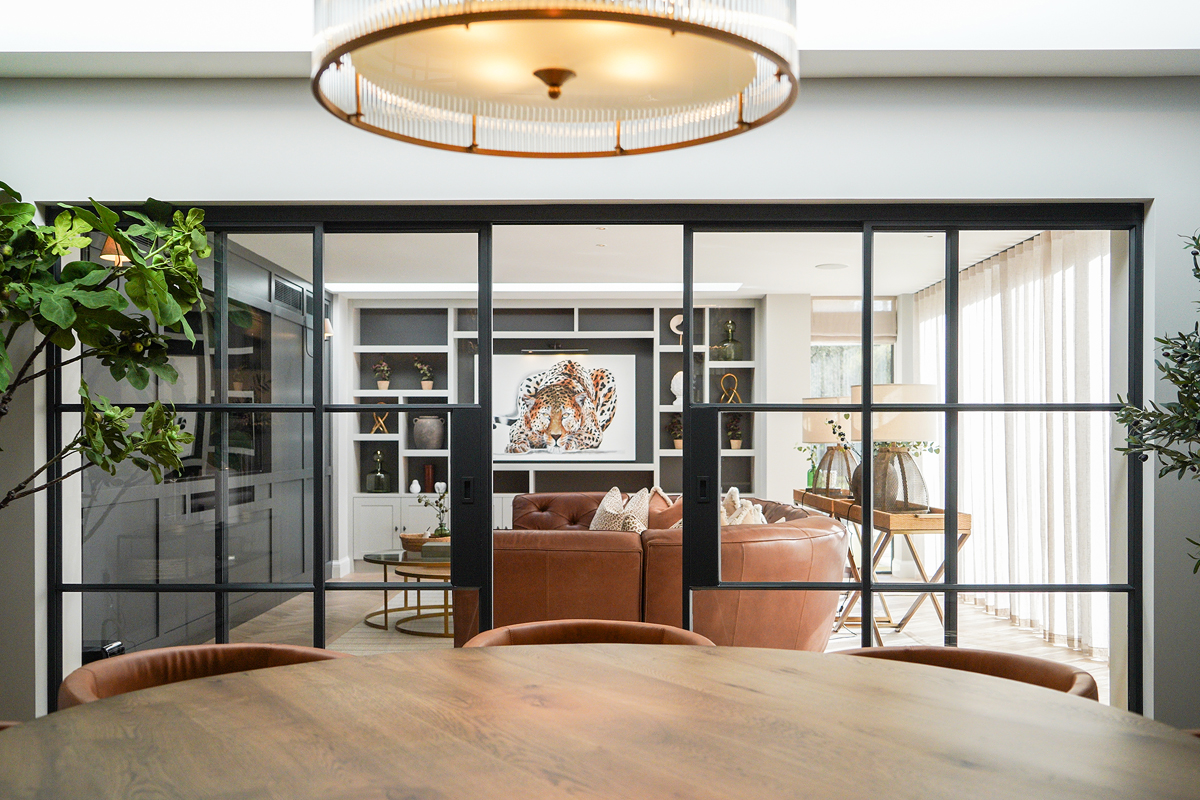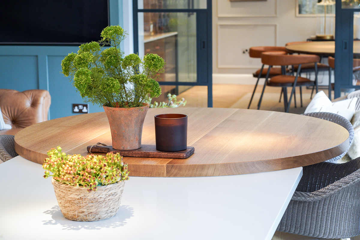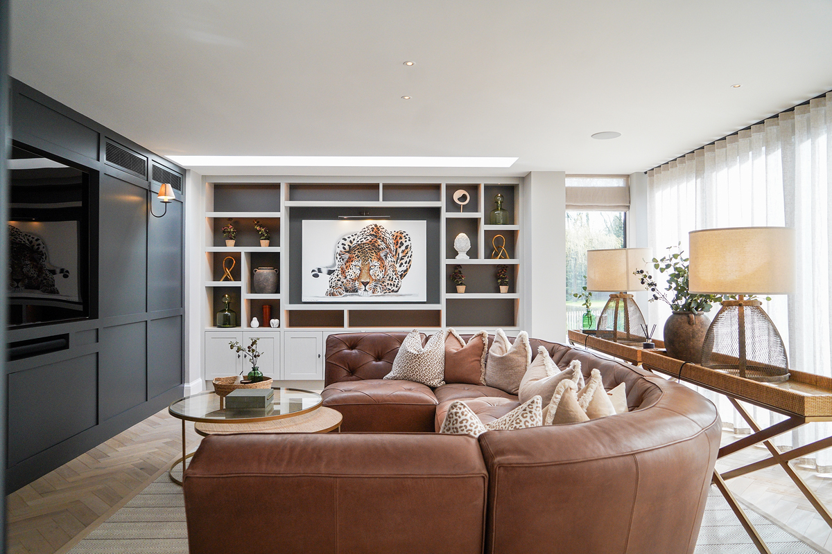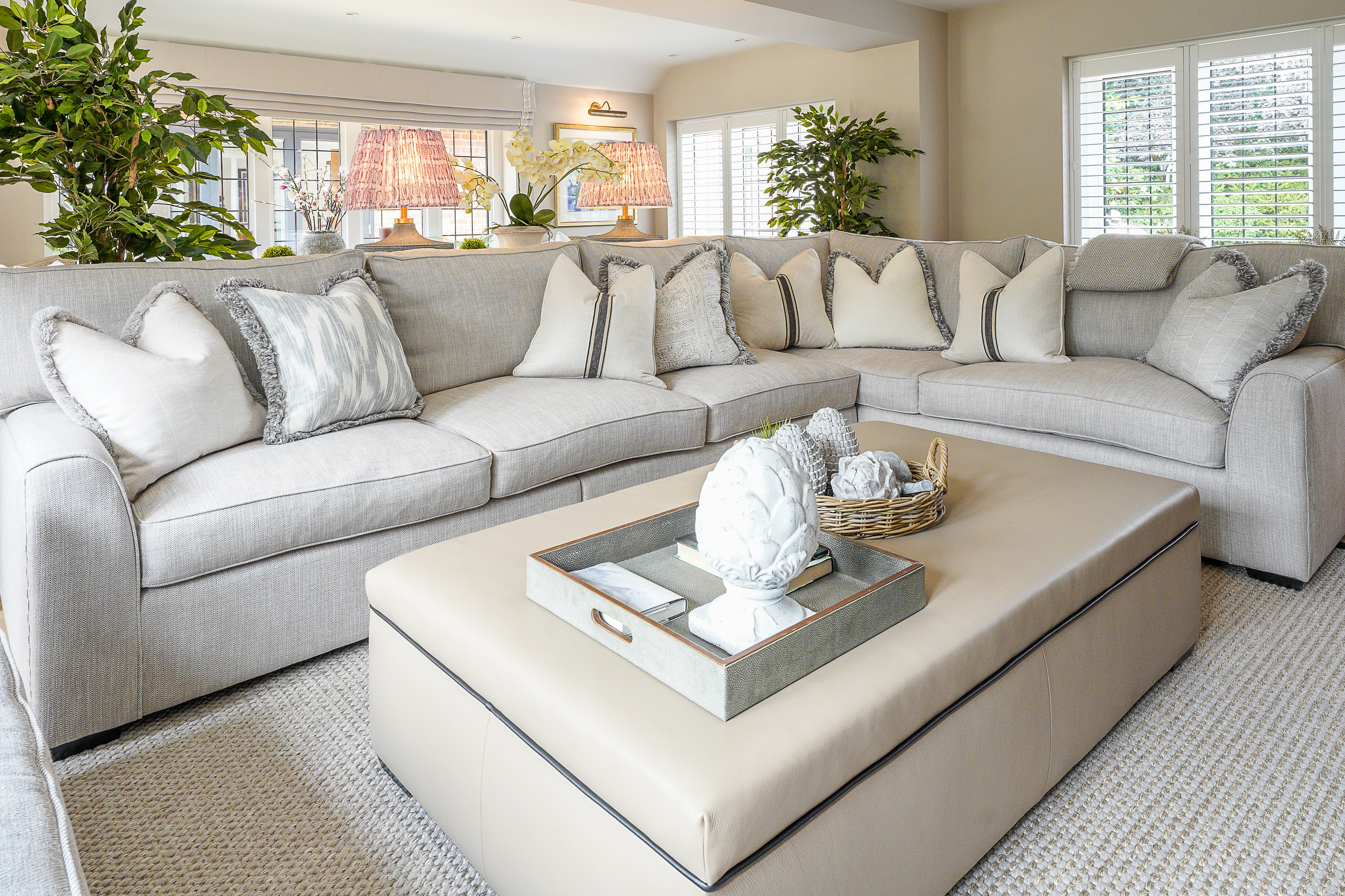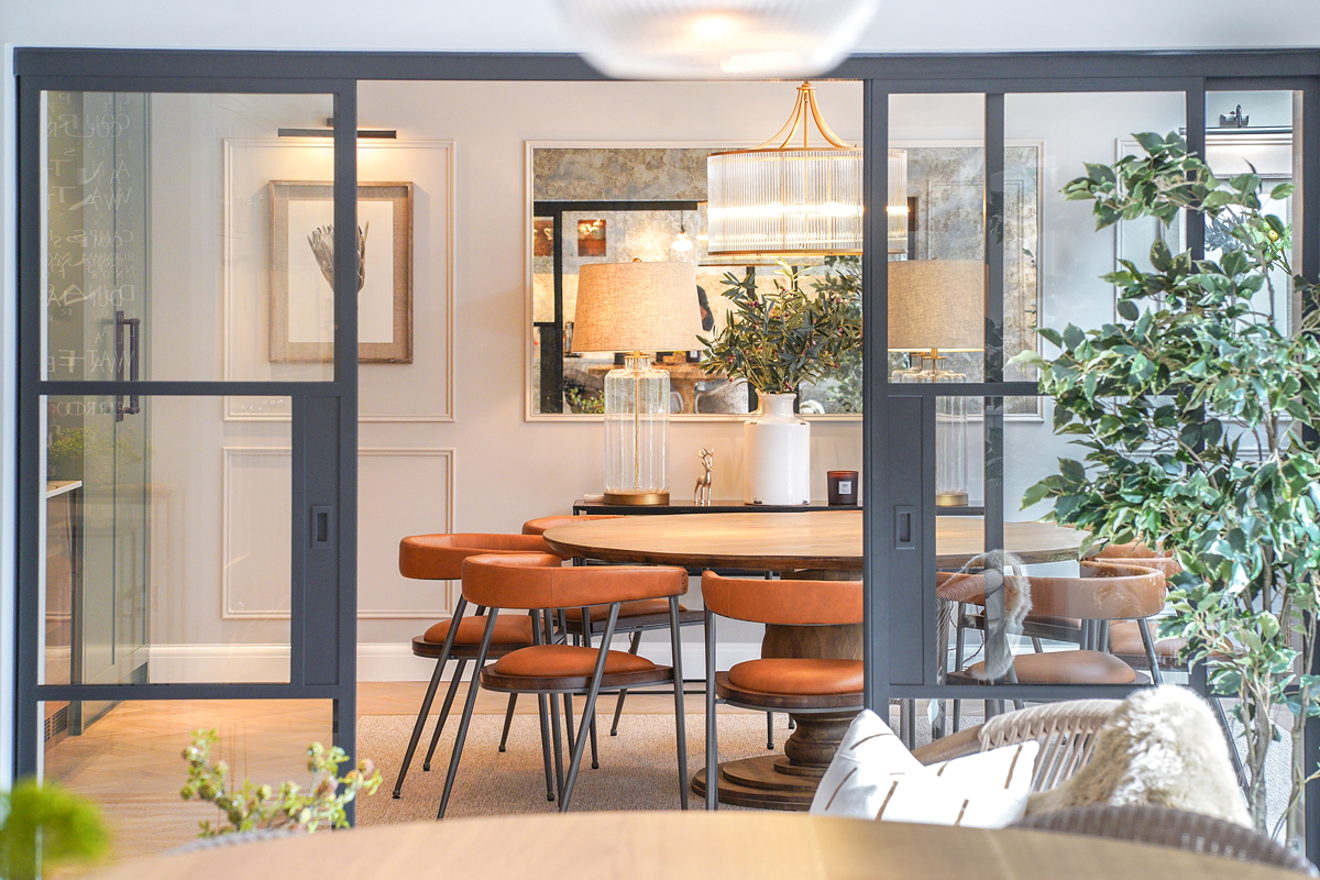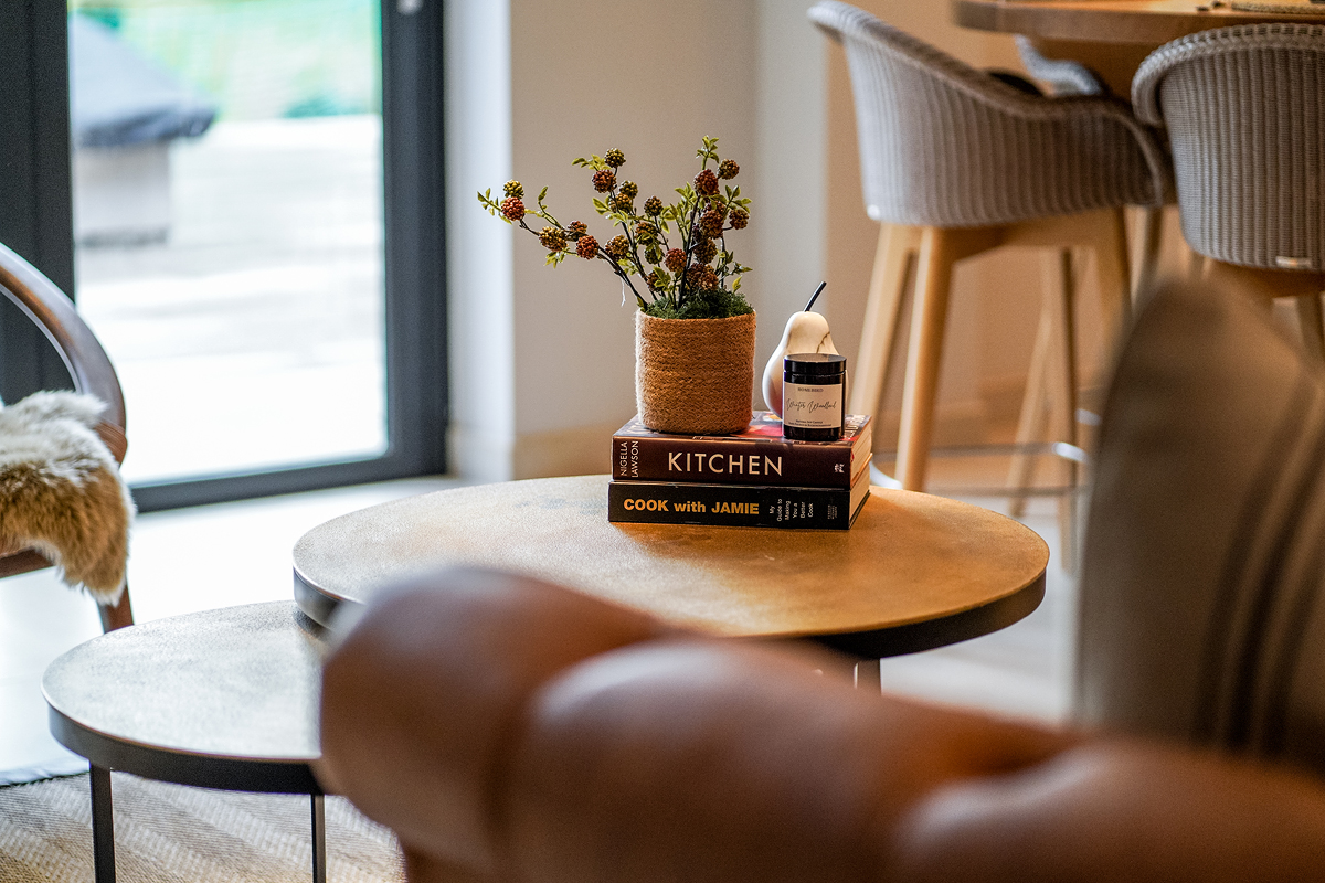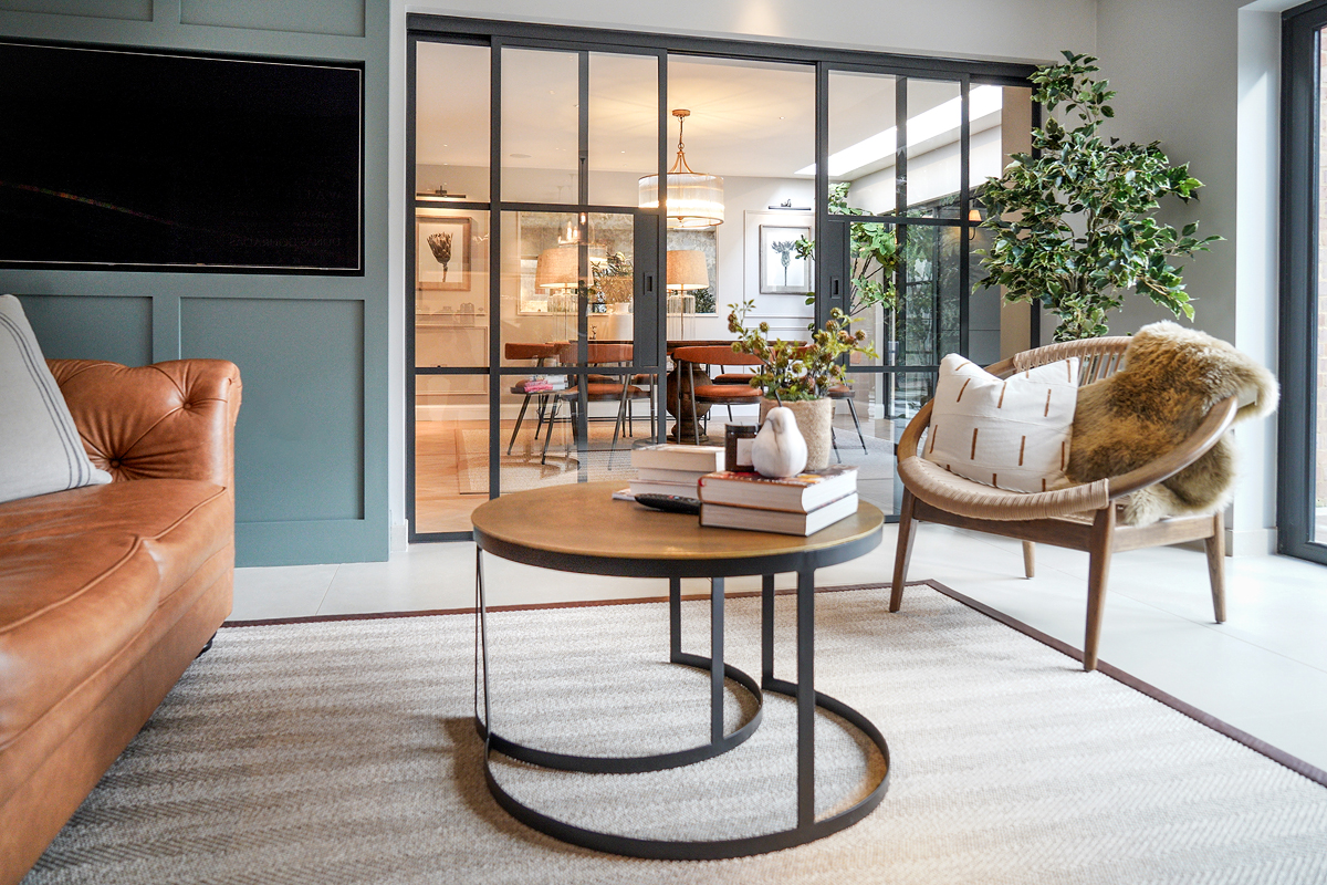 Both ends of this expansive country home, including garden facing extension were given a fresh facelift. This included procurement of bespoke sofas and footstools, rugs, new custom curtains and blinds expertly fitted by our talented curtain maker, kitchen furniture, joinery throughout and a stunning dining area featuring a sociable circle of our London Chairs in cognac.