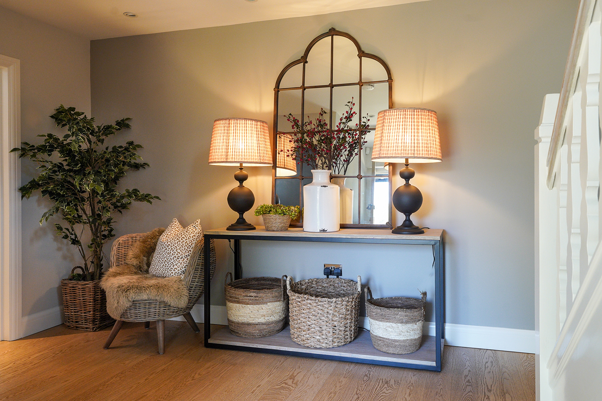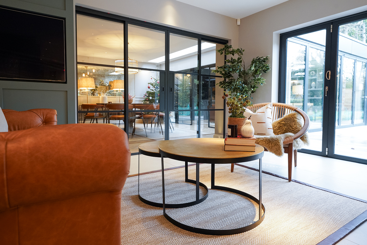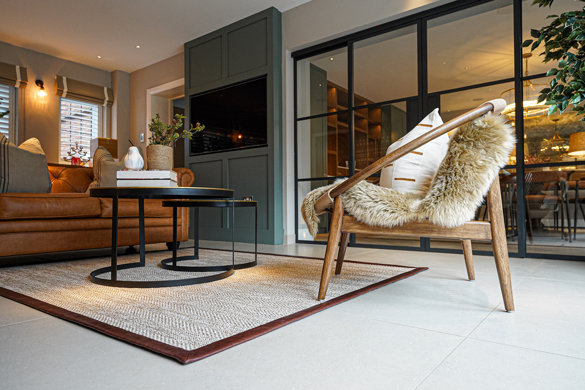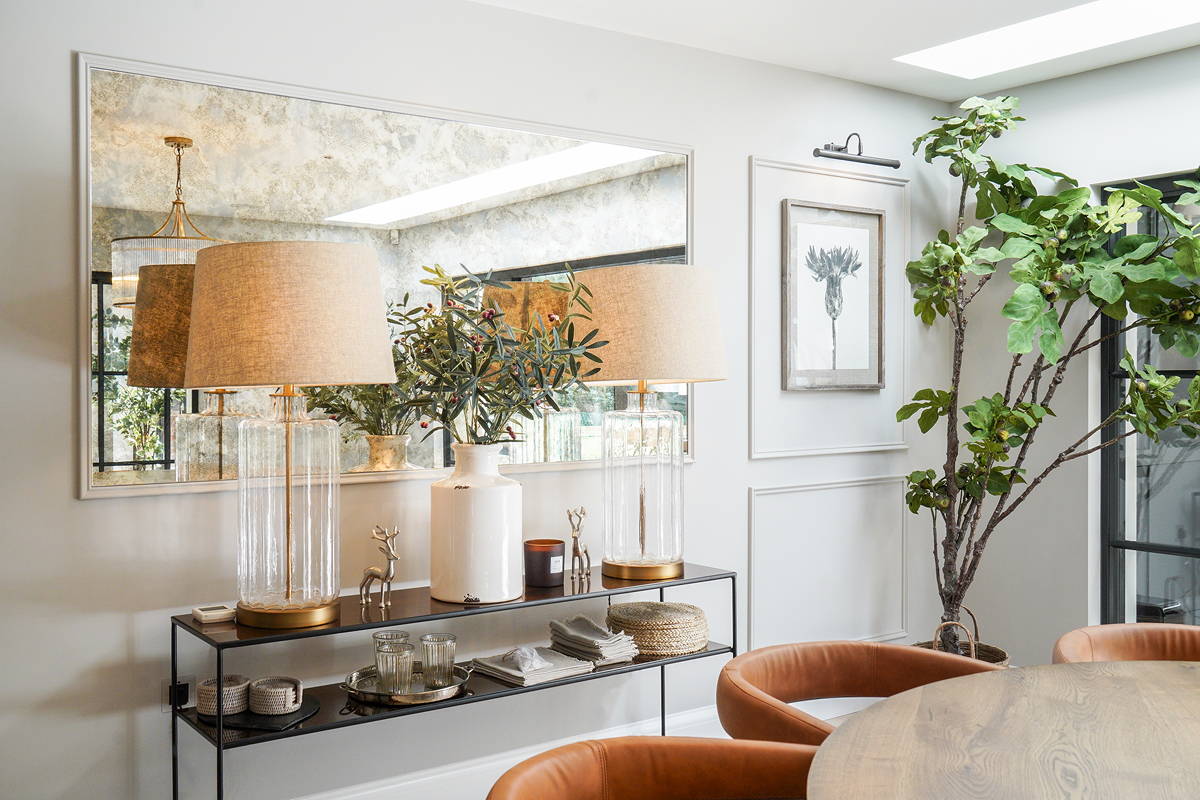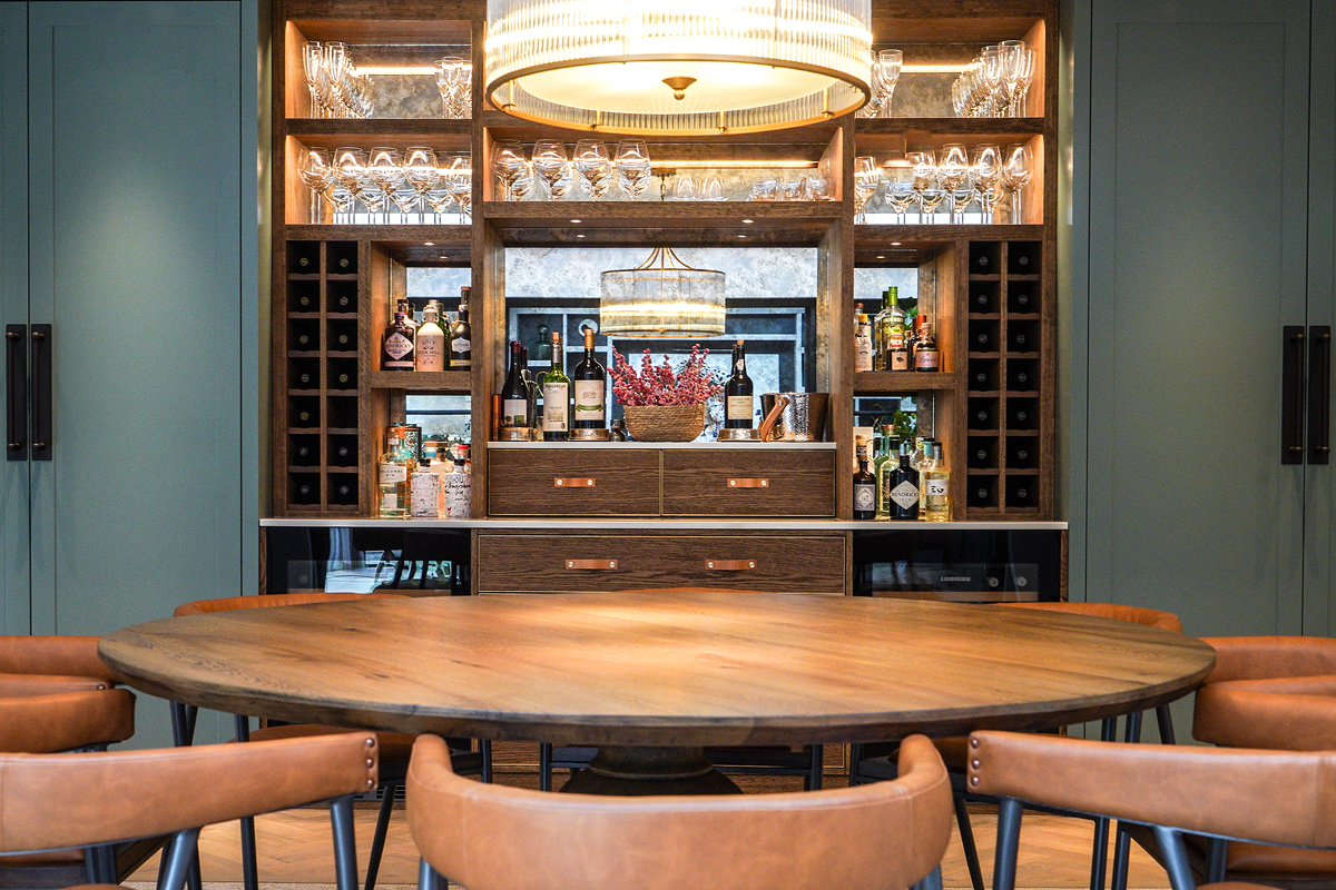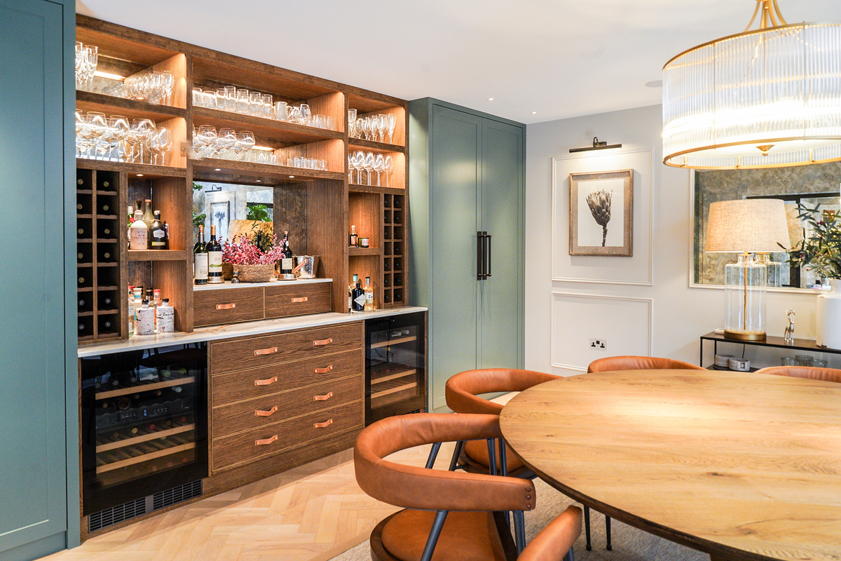 Both ends of this expansive country home, including garden facing extension were given a fresh facelift. This included procurement of bespoke sofas and footstools, rugs, new custom curtains and blinds expertly fitted by our talented curtain maker, kitchen furniture, joinery throughout and a stunning dining area featuring a sociable circle of our London Chairs in cognac.