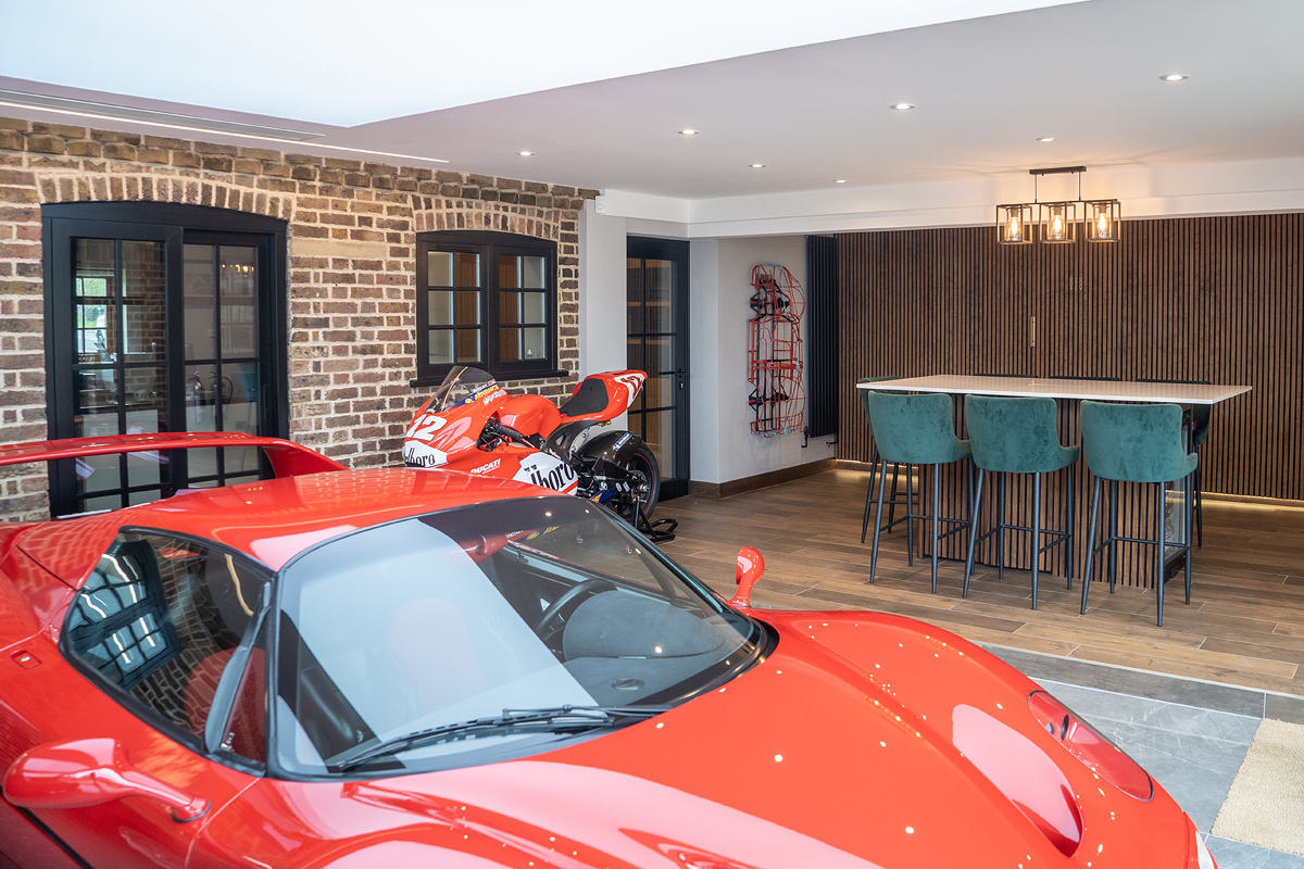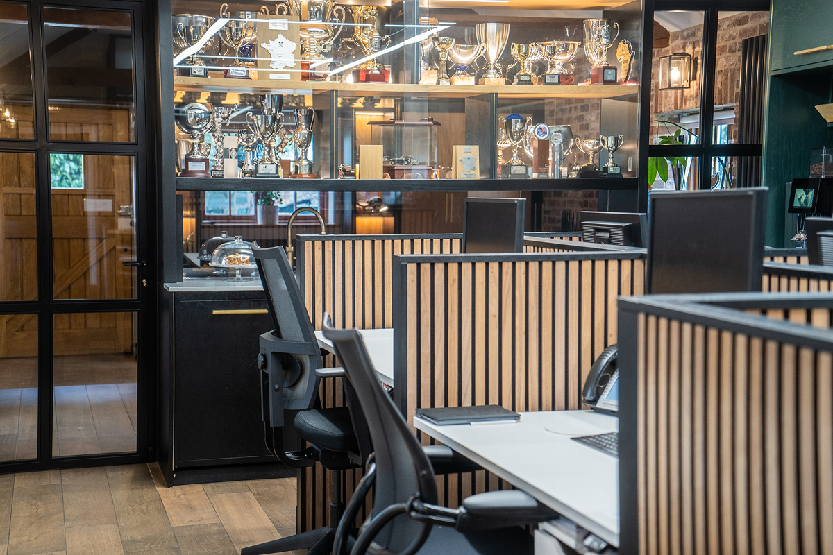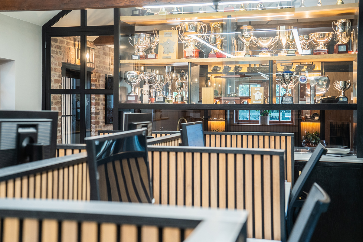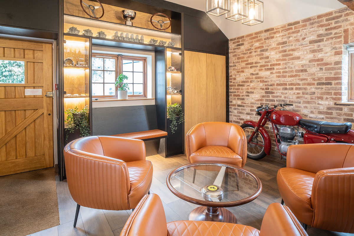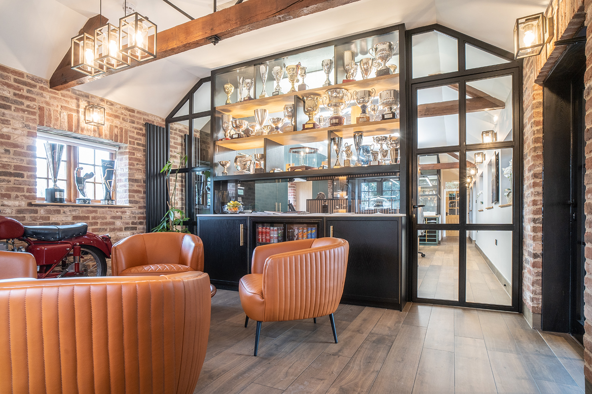 Ali's brief was to transform an unremarkable barn-office into an impressive and distinctive reception and workspace, reflecting the luxury of the top end brands of sports car being bought and sold here. From the use of super soft car leather on the chairs to the original design of her unique Ferrari steering wheel coffee table, she combines the classic with the dynamic, the rustic with the modern. The crittall panels and metres of glass sit easily within the open brick walls and provide both a sense of space, and a welcoming yet exclusive environment for guests and staff alike to enjoy.